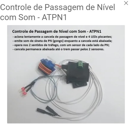 Controle de Passagem de Nível com Som - ATPN1 controle com servomotor para acionamento lento de cancelas; dois sensores, para acionar pelos dois lados da PN, com som de sinalização de PN; quatro LEDs piscantes para colocar em postes de sinalização; simplifica a automatização das suas cancelas de PN, para escalas N, HO, S e O. IMAGENS E FOTOS MERAMENTE ILUSTRATIVAS. APARÊNCIA, OPERACIONALIDADE E CARACTERÍSTICAS DO PRODUTO DEPENDEM DE COMO ELE É MONTADO OU UTILIZADO PELO USUÁRIO.
