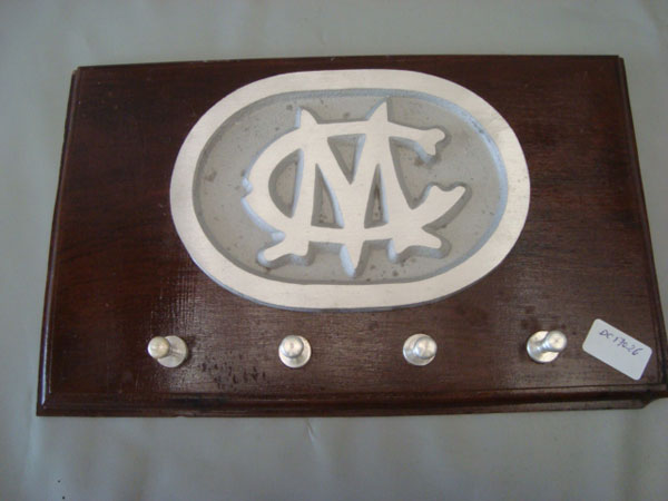 PLACA DE MADEIRA NOBRE FREZADA, MACIÇA. EMBLEMA DA CIA.MOGIANA FUNDIDA EM ALUMINIO. PRODUTO ARTESANAL. COMO TAL PODE APRESENTAR CERTAS IMPERFEIÇÕES QUE NO FIM O TORNAM MAIS \\\"ENVELHECIDOS\\\". NO CASO A PONTA INFERIOR DIREITA DE QUEM OLHA ESTÁ QUEBRADA. PLACA DE MADEIRA NOBRE FREZADA, MACIÇA. EMBLEMA DA CIA.PAULISTA FUNDIDA EM ALUMÍNIO. PINOS PARA CHAVES USINADOS EM ALUMINIO IMITAM OS TRINCOS DOS VAGÕES DE PASSAGEIROS ANTIGOS IMAGENS E FOTOS MERAMENTE ILUSTRATIVAS. APARÊNCIA, OPERACIONALIDADE E CARACTERÍSTICAS DO PRODUTO DEPENDEM DE COMO ELE É MONTADO OU UTILIZADO PELO USUÁRIO.